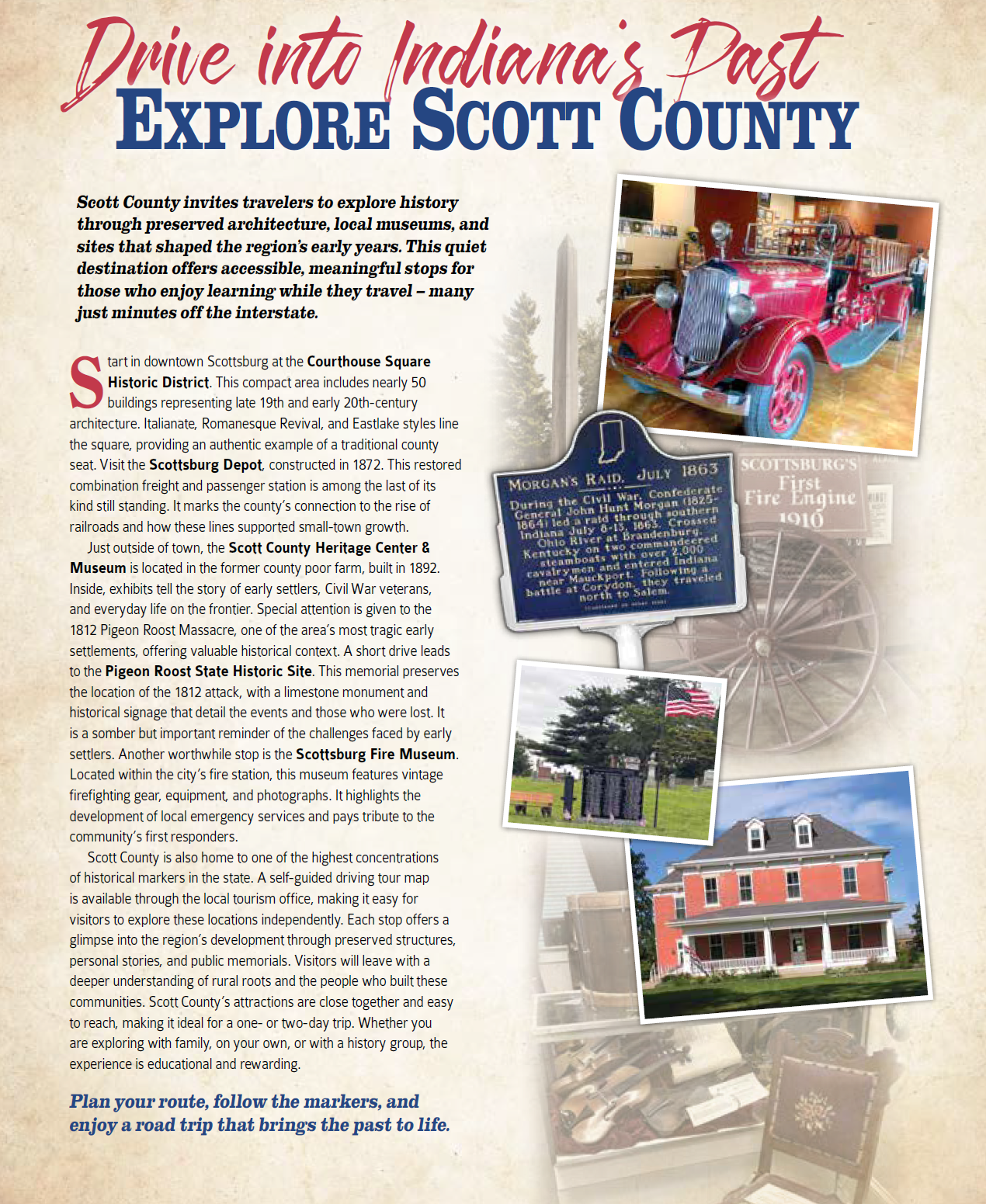 We can provide a local step-on guide that will help you travel the scenic backroads of Scott County while learning about the fascinating history of Scott County and the people who helped forge it. From early settlers and the impact of wars to entrepreneurs and the contributions the people of Scott County have made in the world around us.
